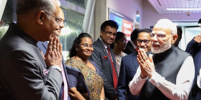कोलंबो। प्रधानमंत्री नरेन्द्र मोदी श्रीलंका की तीन दिवसीय यात्रा पर शुक्रवार शाम कोलंबो पहुंचे, जहां बारिश के बावजूद टॉप-5 मंत्रियों ने उनका जोरदार स्वागत किया। बता दें कि प्रधानमंत्री बैंकाक की अपनी यात्रा पूरी करने के बाद श्रीलंका की राजधानी पहुंचे हैं। उन्होंने बैंकाक में बिम्सटेक (बहु-क्षेत्रीय तकनीकी और आर्थिक सहयोग के लिए बंगाल की खाड़ी पहल) के शिखर सम्मेलन में हिस्सा लिया था। प्रधानमंत्री मोदी शनिवार को श्रीलंका के राष्ट्रपति अनुरा कुमारा दिसानायके के साथ व्यापक वार्ता करेंगे।