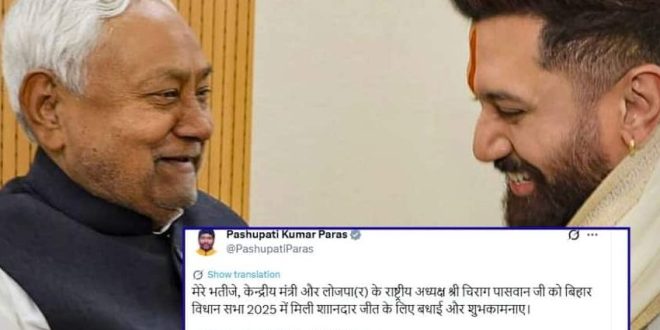 चिराग की इस जीत से जहां जनता में खुशी की लहर है, तो वहीं कभी बगावत कर चुके उनके चाचा पशुपति कुमार पासवान ने भी खुशी जाहिर की है. उन्होंने भतीजे चिराग को बधाई देते हुए सोशल मीडिया पर लिखा- मेरे भतीजे, केन्द्रीय मंत्री और लोजपा(र) के राष्ट्रीय अध्यक्ष श्री चिराग पासवान जी को बिहार विधान सभा 2025 में मिली शाानदार जीत के लिए बधाई और शुभकामनाएं.