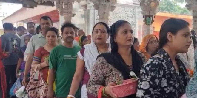 दूधेश्वरनाथ मंदिर में लाइन में लगे शिवभक्त।