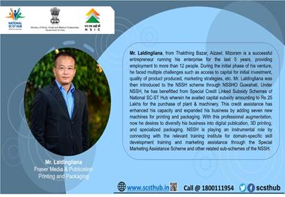 लालडिंगलियाना, मिजोरम के आइज़ावी स्थित थाकथिंग बाज़ार के एक सफल उद्यमी हैं, जो पिछले 5 वर्षों से अपना उद्यम चला रहे हैं और 12 से अधिक लोगों को रोजगार प्रदान कर रहे हैं। अपने उद्यम के प्रारंभिक चरण के दौरान, उन्हें कई चुनौतियों का सामना करना पड़ा, जैसे प्रारंभिक निवेश के लिए पूंजी तक पहुंच, उत्पाद की गुणवत्ता और विपणन रणनीतियाँ आदि। एनएसएसएचओ, गुवाहाटी के माध्यम से लालडिंगलियाना को एनएसएसएच योजना के बारे में जानकारी मिली। एनएसएसएच के अंतर्गत, उन्हें राष्ट्रीय एससी-एसटी हब के विशेष ऋण से जुड़ी सब्सिडी योजना का लाभ मिला। उन्होंने संयंत्र और मशीनरी की खरीद के लिए 25 लाख रुपये की पूंजी सब्सिडी का लाभ उठाया। इस ऋण सहायता ने उनकी क्षमता बढ़ाई है तथा मुद्रण और पैकेजिंग के लिए सात अतिरिक्त नई मशीनों के साथ उनके व्यवसाय का विस्तार किया है। इस व्यावसायिक उन्नति के साथ, अब वे अपने व्यवसाय को डिजिटल प्रकाशन, 3डी प्रिंटिंग और विशेष पैकेजिंग की विविधता प्रदान करना चाहते हैं। एनएसएसएच विशेष विपणन सहायता योजना और अन्य संबंधित उप-योजनाओं के माध्यम से क्षेत्र-विशिष्ट कौशल विकास प्रशिक्षण और विपणन सहायता के लिए प्रासंगिक प्रशिक्षण संस्थान से जुड़कर एक महत्वपूर्ण भूमिका निभा रहा है।